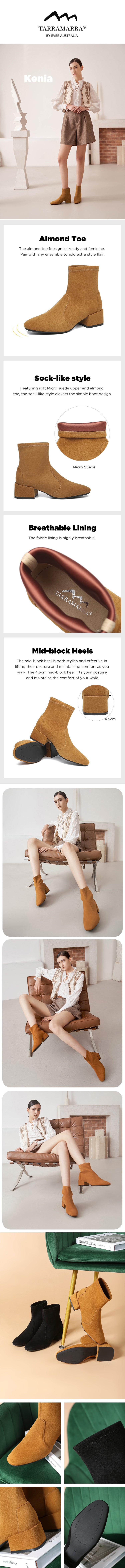 The Tarramarra Kenia Ankle Boots are the must-have in your trans-seasonal wardrobe. A feminine design that meets trendiness, they can be paired with almost any ensemble to add extra style flair. The mid-block heel is both stylish and effective in lifting their posture and maintaining comfort as you walk. The upper soft microsuede material means that it will sit comfortably around your ankles.